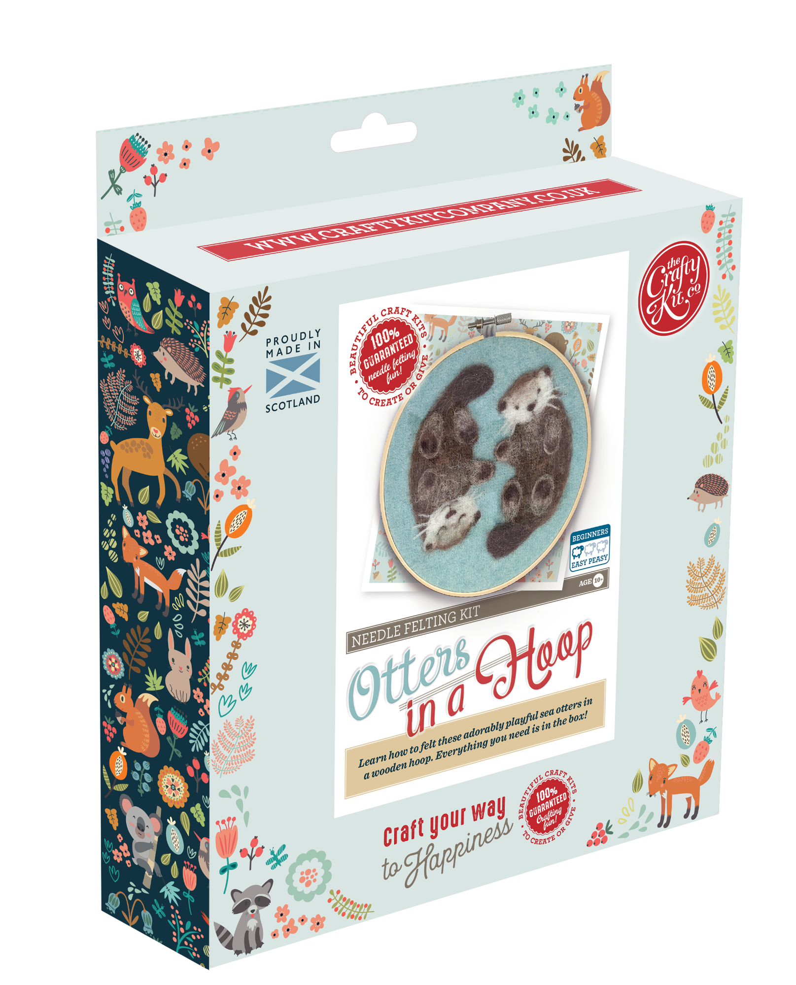 Your Otters in a Hoop Needle Felting Craft Kit contains: 100% Corriedale wool, wool mix felt fabric, a recycled foam mat, felting needles, bamboo embroidery hoop, needle and thread, full colour instructions.