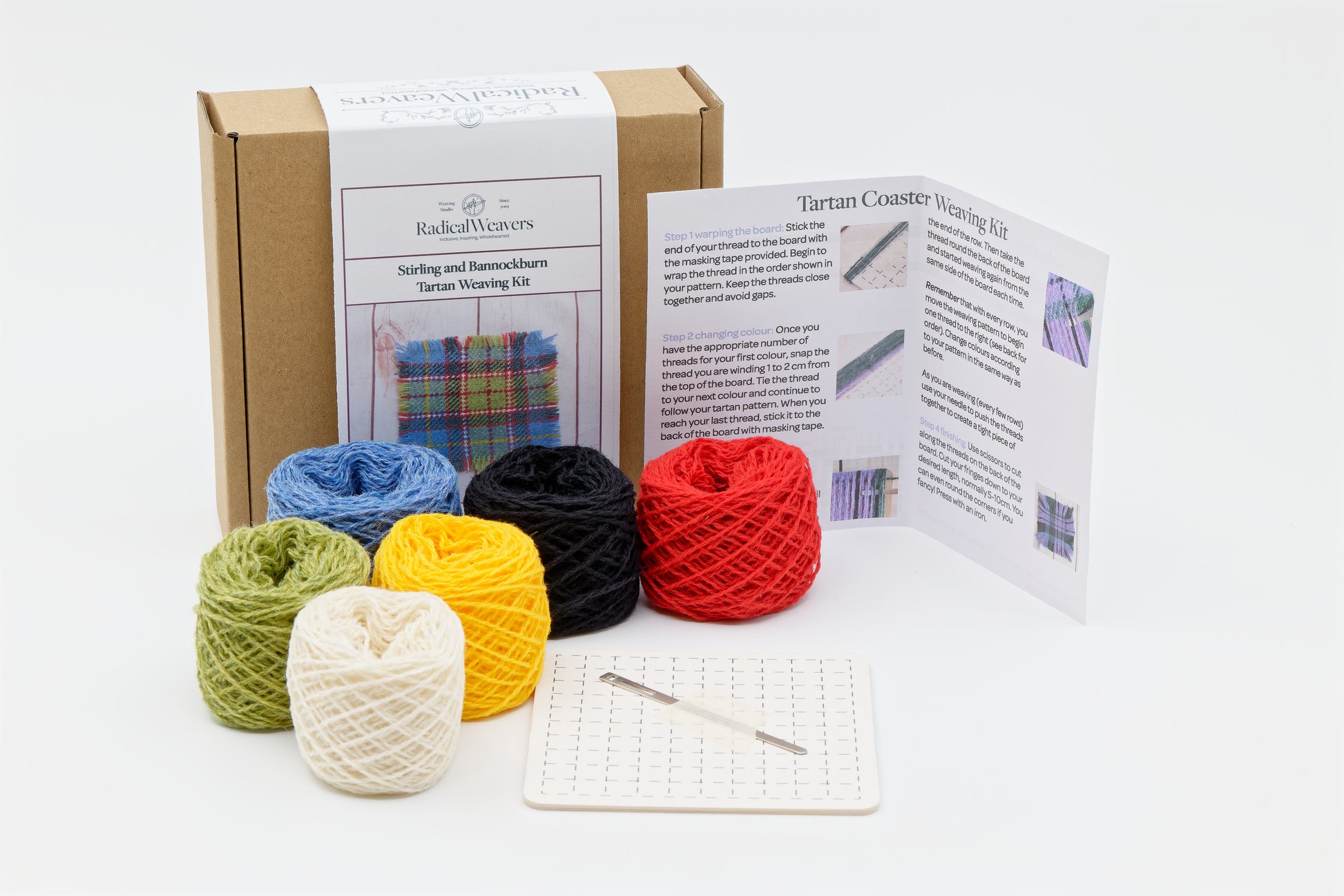 Our step-by-step instructions guide you through a classic Scottish tartan pattern and teach you the timeless twill technique. The kit includes high-quality Scottish Shetland pure wool, a specially designed bodkin needle for smooth weaving, a sturdy weaving board with guides, and our unique instructions featuring an interpretation of the iconic Stirling & Bannockburn tartan.