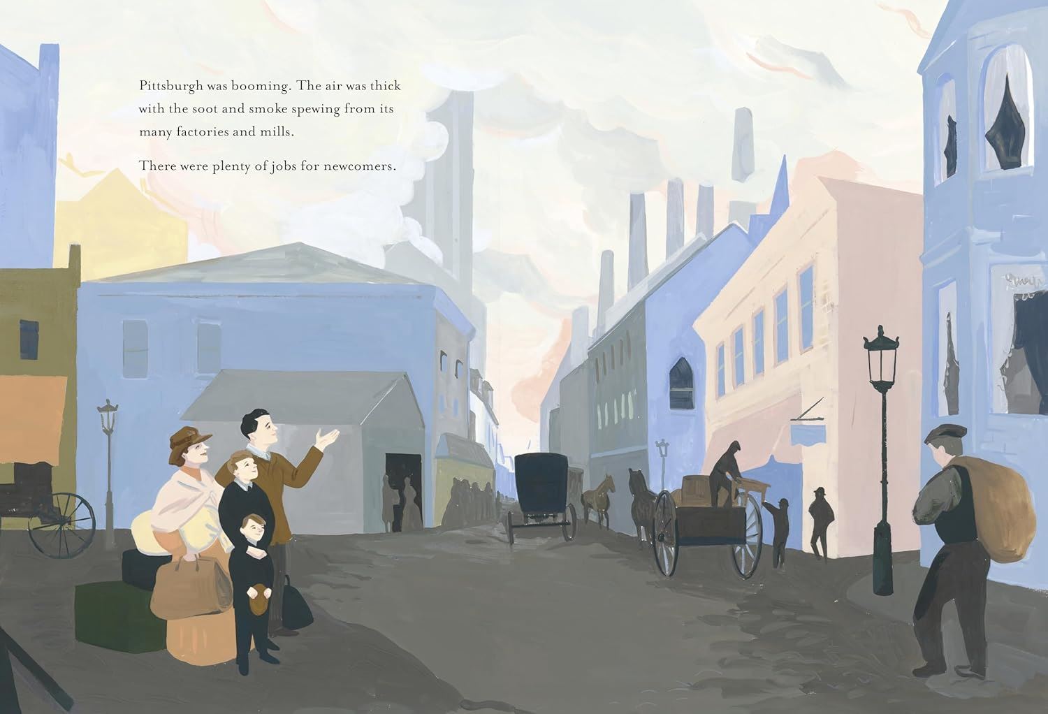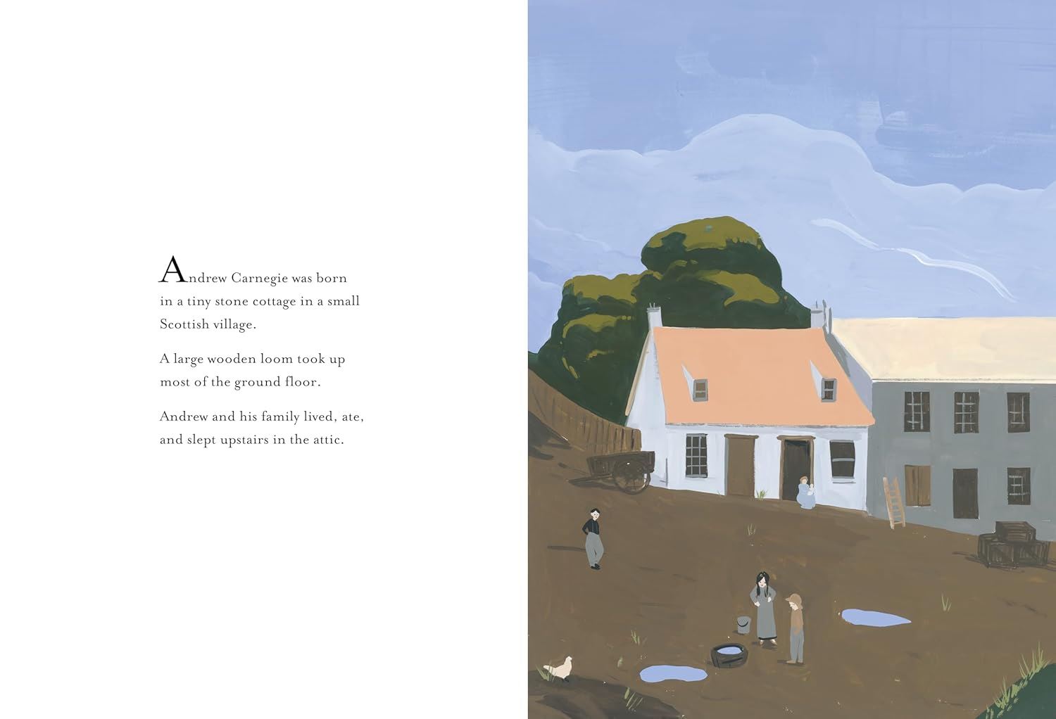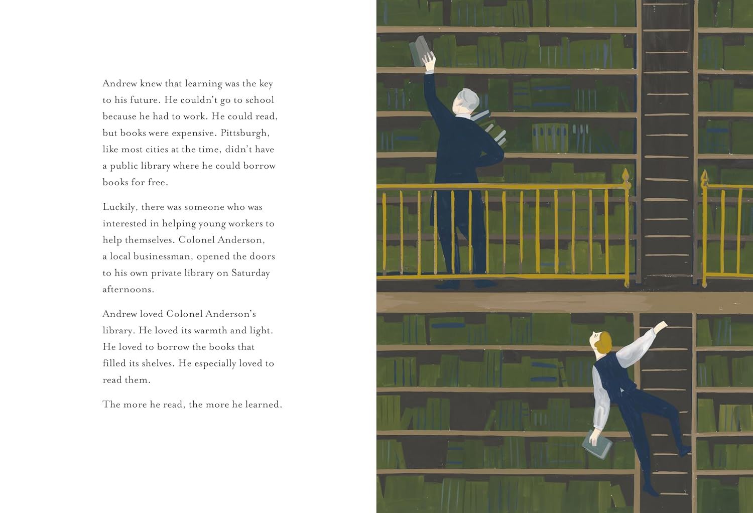 Andrew Carnegie arrived in America from Scotland in 1848. He was just 12 years old. He worked in factories and telegraphy, invested in railways, built and then sold a steel company, and became the richest American of all time. Carnegie believed strongly in sharing his wealth, and one of the ways he did this was by paying for thousands of public libraries around the world. Told in simple, lyrical text, Carnegie’s story unfolds against striking, stylized illustrations that transport young readers to the bustle and boom of the Industrial Revolution